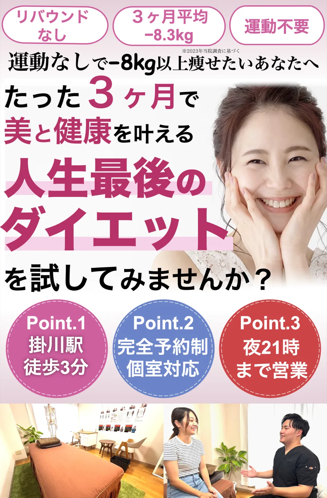 しかし、当院では期間中に痩せるのはもちろん、それ以降もリバウンドせずにどうやったらお客様が継続してずっと痩せ続けられるのか?
